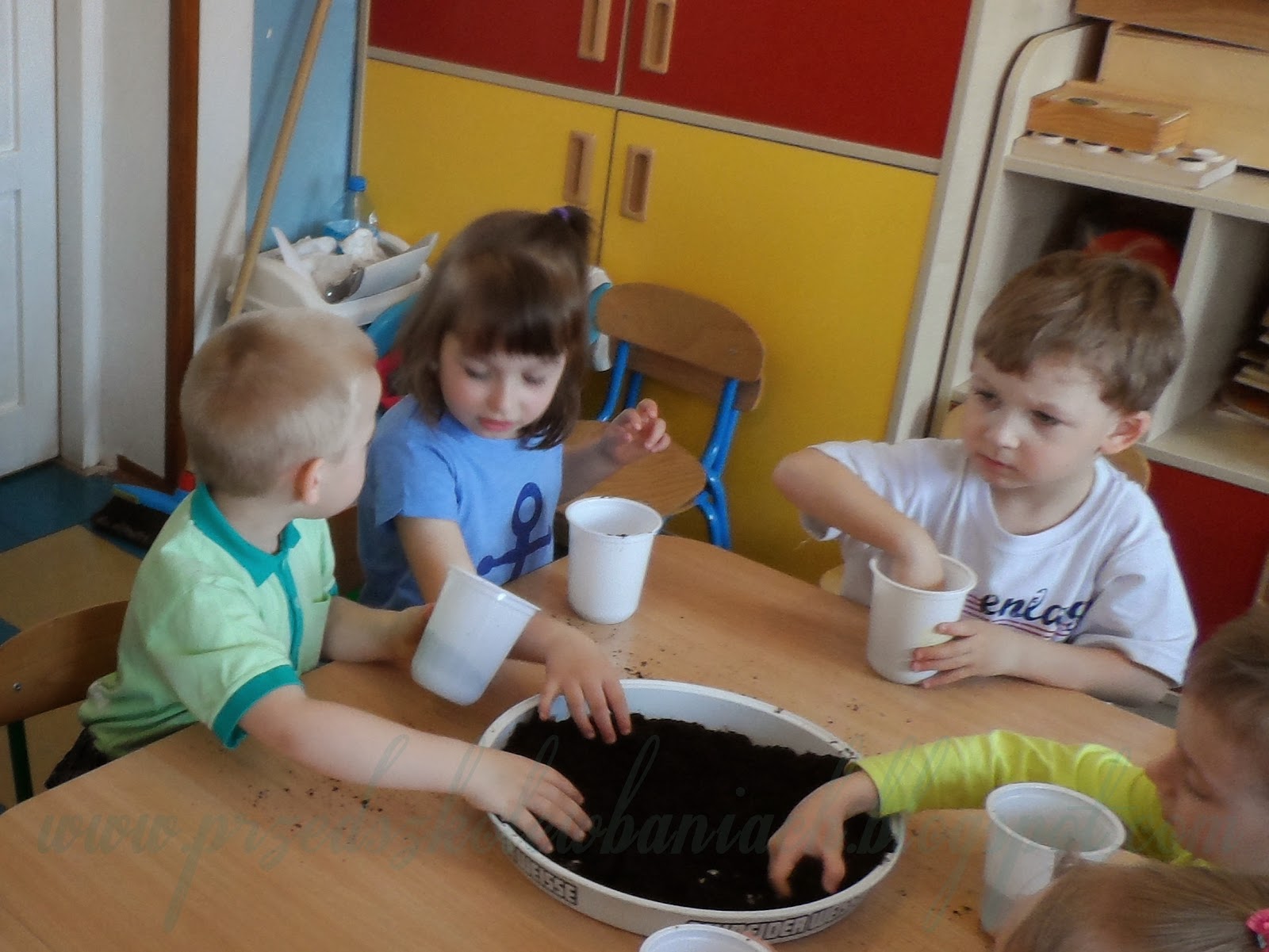 Stąd my dziś bawiliśmy się w ogrodników. Jest wiosna co sprzyja odkrywaniu w sobie zdolności ogrodniczych. W naszej sali na oknie właśnie stanęły doniczki i skrzyneczki w których posialiśmy nasionka i posadziliśmy cebulki. Teraz będziemy je podlewać i obserwować ich wzrost.
