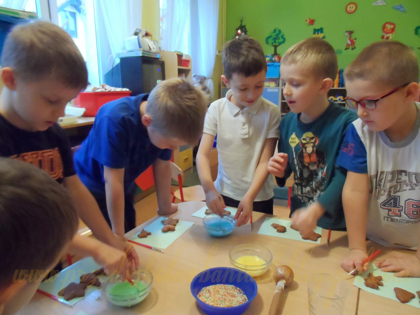 Po przygotowaniu ciasta, rozwałkowaliśmy je na stolnicy i wycięliśmy ciasteczka o różnych kształtach, które starannie układaliśmy na blaszce. Upieczone pierniczki ozdobiliśmy lukrem i posypką, a po wyschnięciu spakowaliśmy w małe paczuszki z kolorowa wstążką, wręczymy je naszym gościom po Bożonarodzeniowym przedstawieniu.