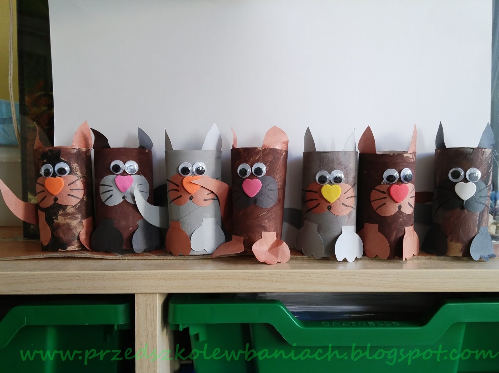 Rolkę pomalowaliśmy wybraną farbą, po wyschnięciu przystąpiliśmy do ozdabiania. Za pomocą kleju przymocowaliśmy wycięte z kolorowego papieru uszy, łapki, ogonek i pyszczek. Na koniec przykleiliśmy ruchome oczy i piankowy nosek. I proszę kotki gotowe.