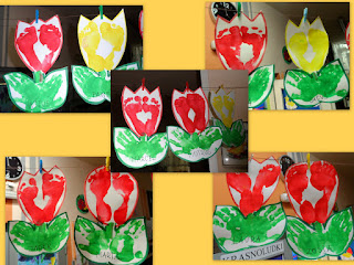 Na kartkach bloku technicznego odbijamy jak pieczątką swoje stopy zanurzone w żółtej lub czerwonej farbie w miejscu pąka i dłonie zanurzone w zielonej farbie w miejscu liści.