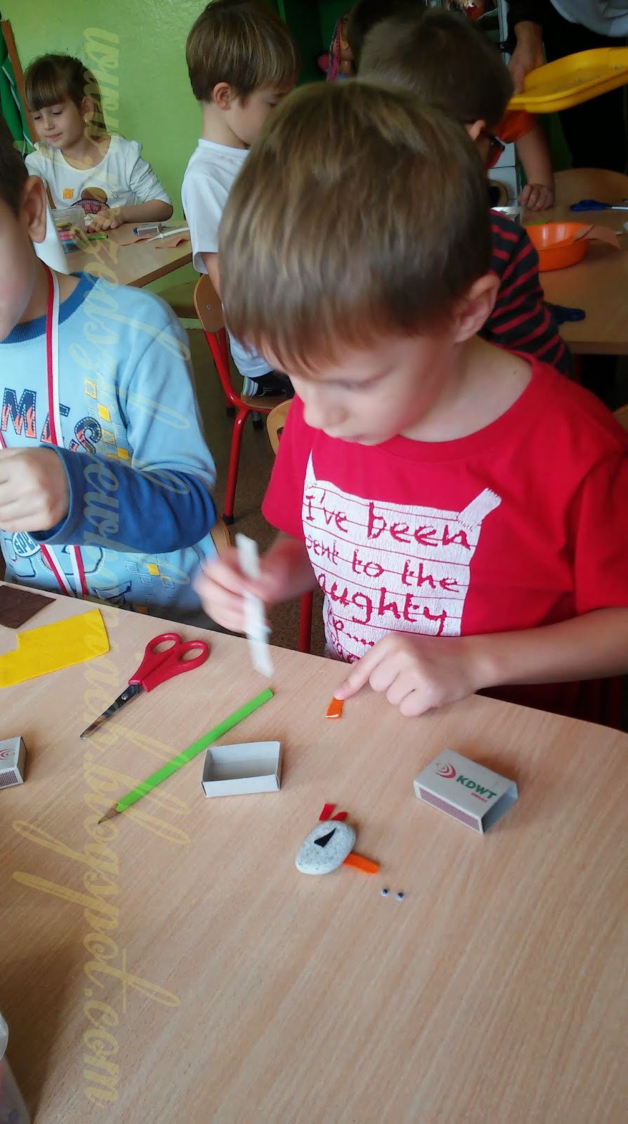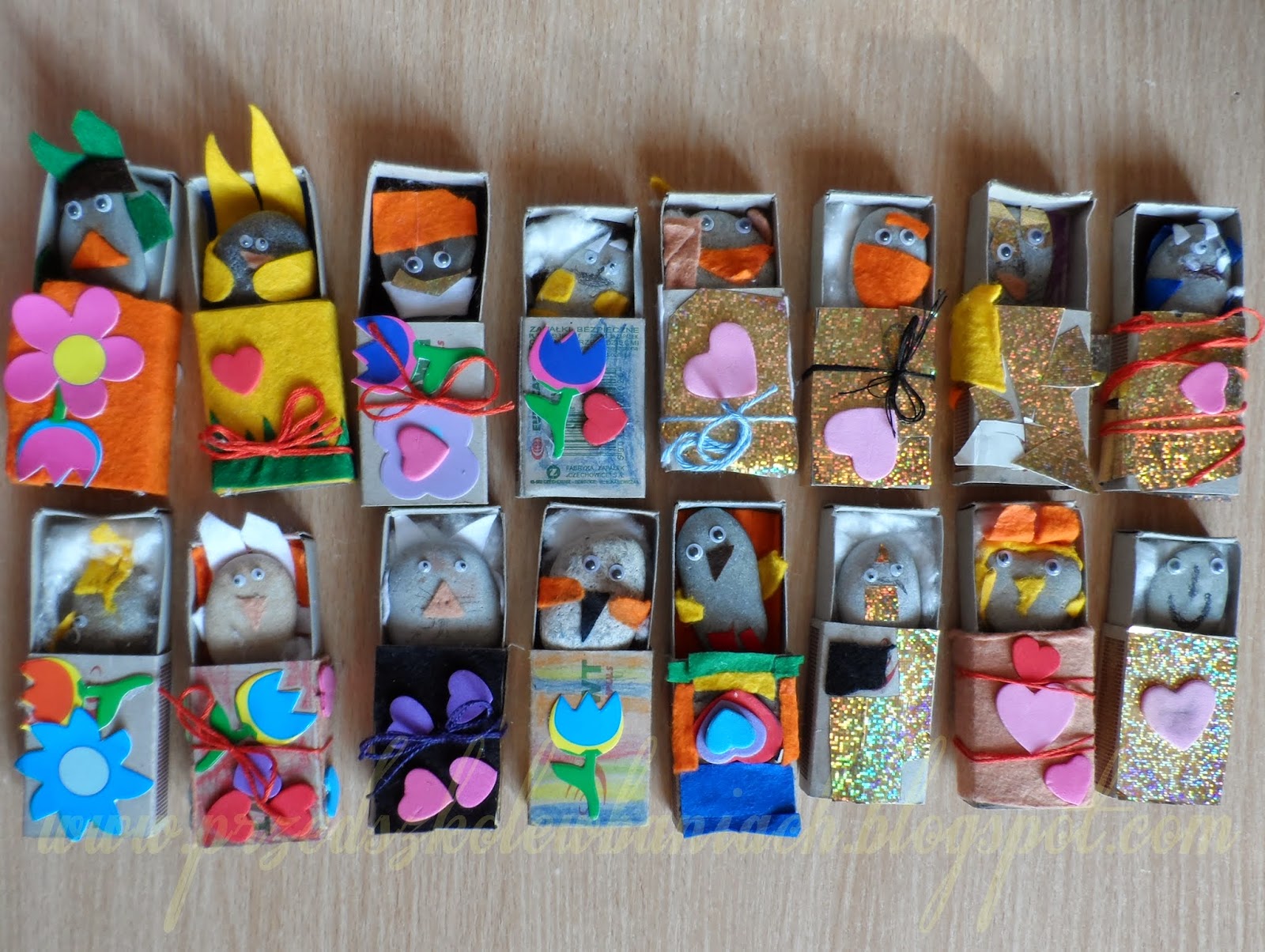 Wybrany kamień pokolorowaliśmy i ubraliśmy według własnego pomysłu w filcowe ubranko następnie przykleiliśmy oczy, od tej chwili nasz przyjaciel, którego każde z nas nazwało po swojemu spojrzało na nas pierwszy raz, Teraz dla naszego przyjaciela przygotowaliśmy mieszkanko z ozdobionego samodzielnie pudełeczka. To bardzo wygodne, bo mieści się w kieszenie i możemy go wszędzie ze sobą zabierać.