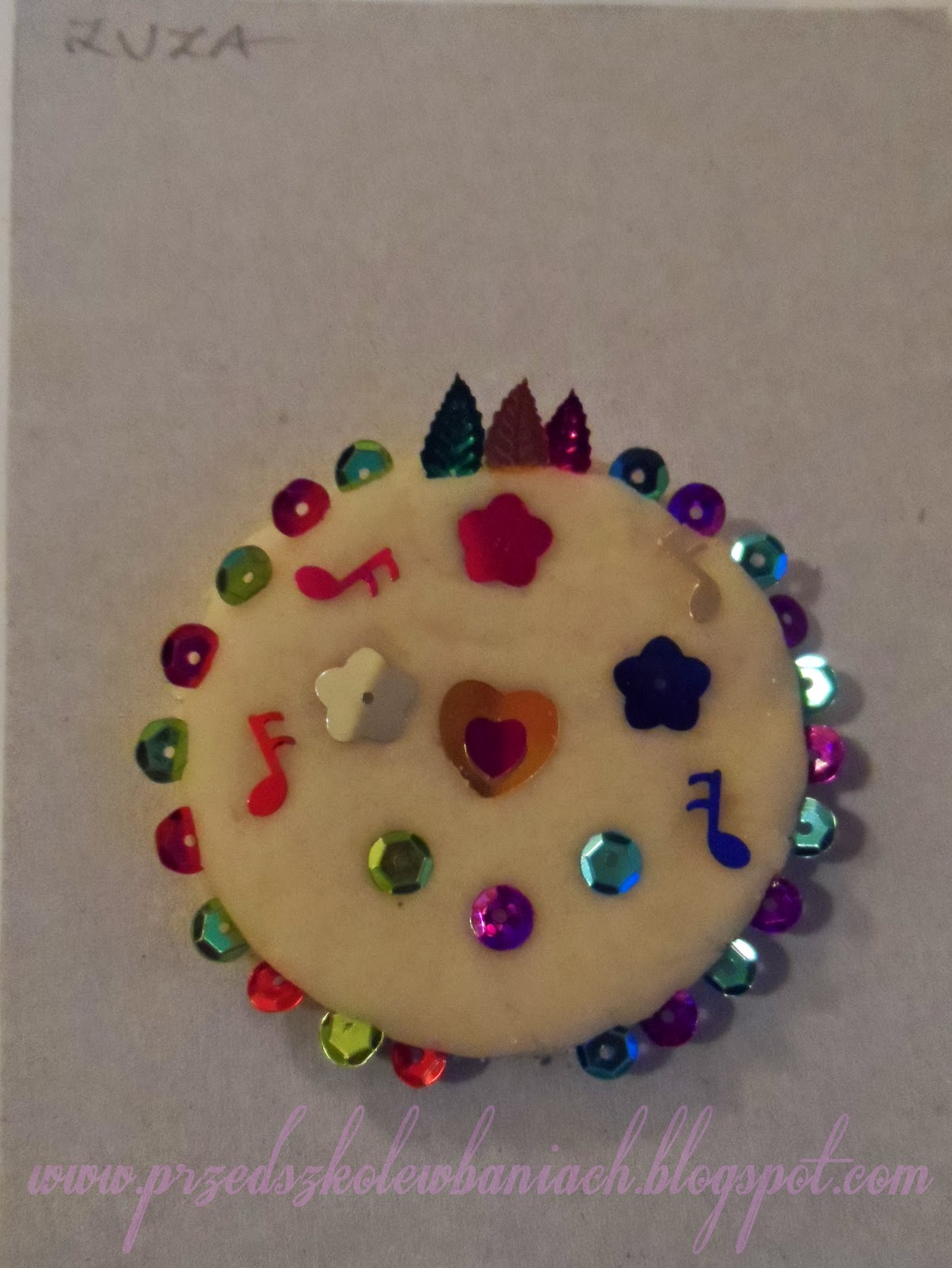 Ciasto rozwałkowaliśmy na stole i wycięliśmy foremką okrągłe placuszki, w których zrobiliśmy dziurkę małą rureczką (do przewleczenia sznurka). Następnie każdy według własnego pomysłu ozdobił swój medal kolorowymi cekinami, lekko zatapiając je w ciasto. Pracę pozostawiliśmy do wyschnięcia, po czy Pani spryskała je lakierem. Gotowe.