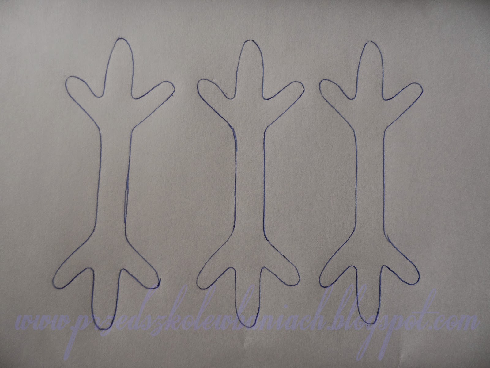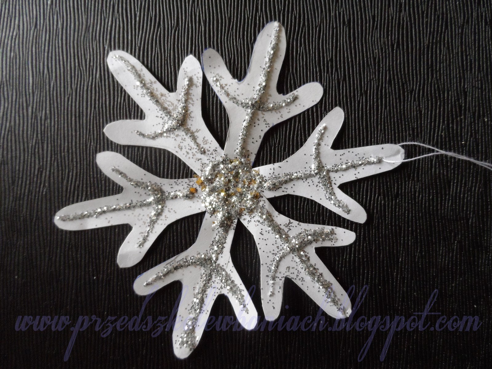 Na białych kartkach obrysowaliśmy trzykrotnie szablon (element śnieżynki). Starannie wycięliśmy te elementy po śladzie i skleiliśmy wszystkie trzy na środku formując śnieżynkę. Śniegowy płatek ozdobiliśmy brokatem, żeby pięknie błyszczał i zawiesiliśmy na gałązce pod sufitem. Gotowe.