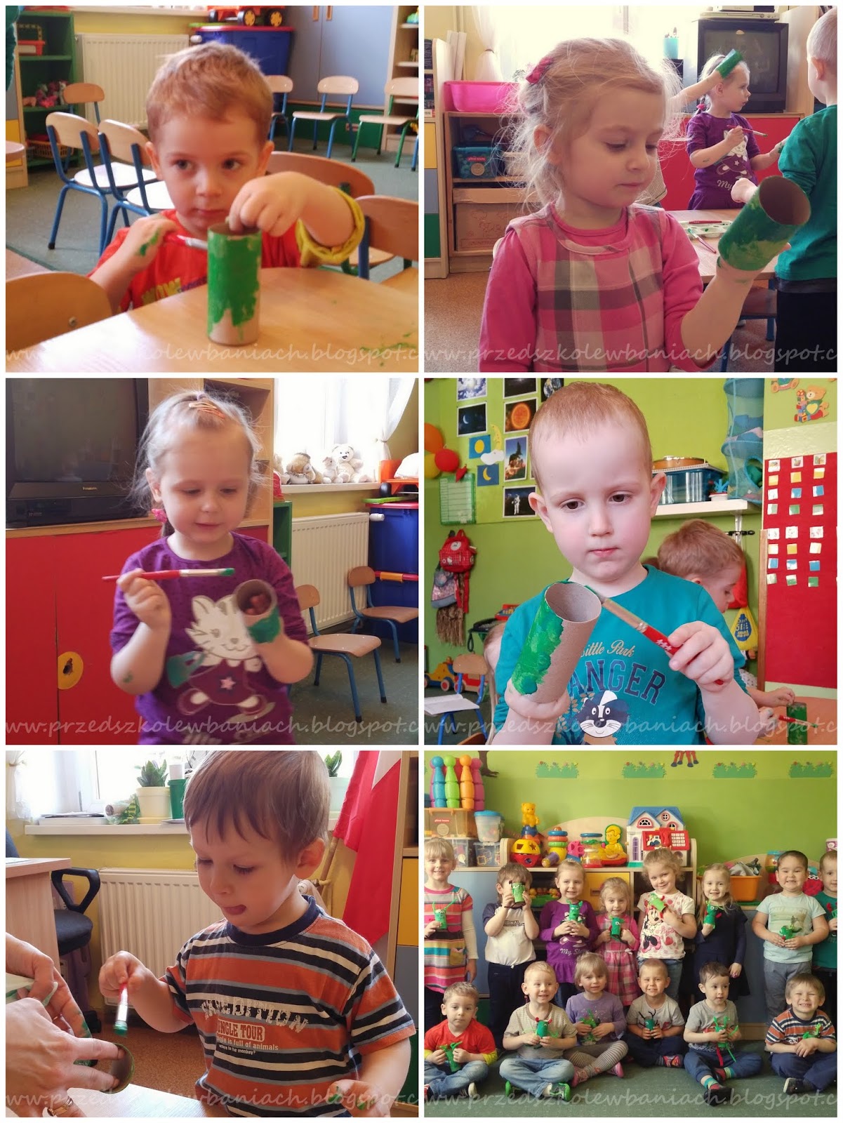 Rolki papueru pomalowaliśmy zieloną farbą. Następnie w dziurki które zrobiła nam Pani, przeciągnęliśmy kolorowe wyciory (każdy według własnego pomysłu). Jeszcze tylko przykleiliśmy oczka, których może być więcej lub mniej niż dwa. W ten sposób powstają ufoludki, każdy inny, bo każdy inaczej wyobraża sobie mieszkańca Obcej Planety.